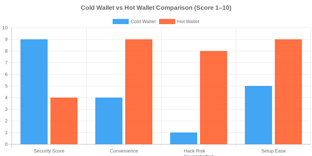The gap isn’t subtle. A hot wallet is accessible from any device, anywhere, instantly. That convenience is also what makes it vulnerable — if your device gets malware, if your exchange gets hacked, if you click the wrong phishing link, the key is reachable.