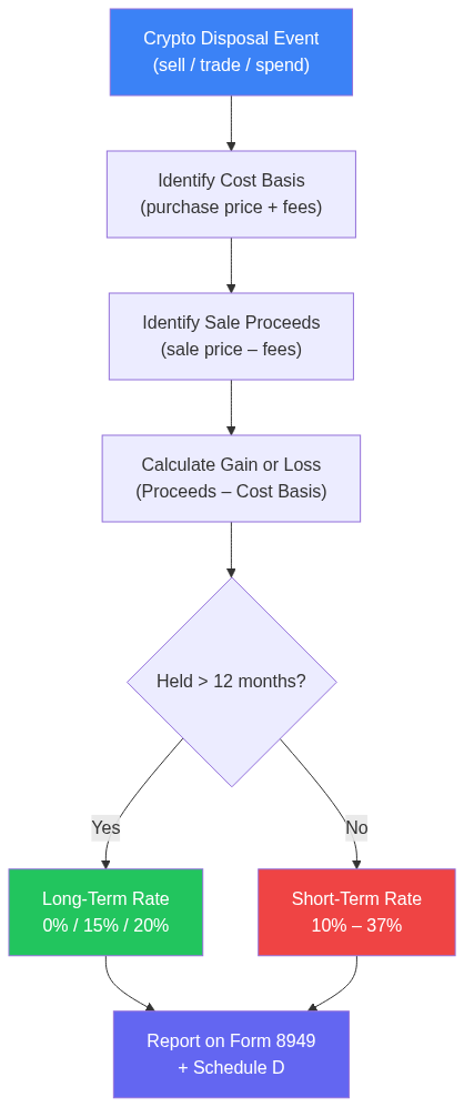 Worked example: You bought 1 ETH for $2,200 (including $5 gas fee). Eight months later you sold it for $3,100 (after $8 in fees). Your proceeds are $3,092, your cost basis is $2,205, your gain is $887. Held for eight months, so it’s short-term — taxed at your income rate, say 22%. Tax owed: ~$195.