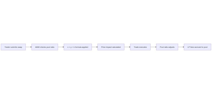 Worked example. Say a pool starts with 100 ETH (x) and 300,000 USDC (y). k = 30,000,000. A trader wants to buy 10 ETH. They’ll pay in USDC until the formula balances: the new pool has 90 ETH, which means y must equal 30,000,000 / 90 = 333,333 USDC. The trader paid ~33,333 USDC for 10 ETH — an effective price of $3,333 per ETH. The starting price was $3,000. That gap is slippage, and it grows as trade size increases relative to pool depth.