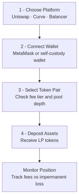 The mechanical process is straightforward. The hard decisions — which pair, which fee tier, how much — come before you open the app.