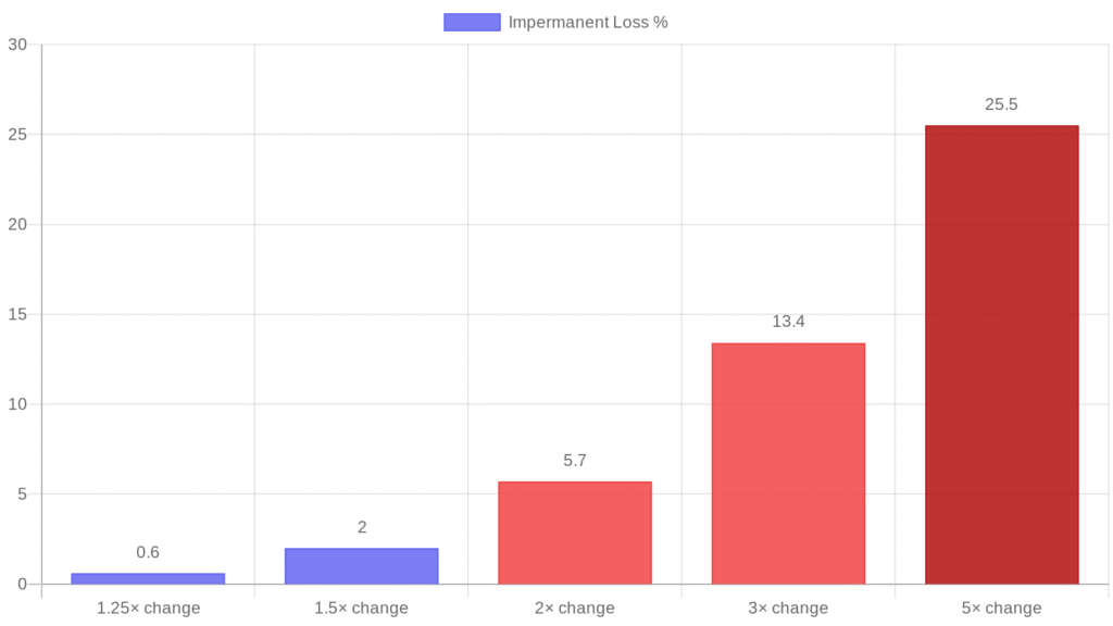 Here’s the math. At a 2× price change in one token, you lose approximately 5.7% versus holding. At a 5× change, that’s 25.5%. The word “impermanent” is technically accurate — if prices return exactly to your entry point, the loss reverses. In practice, prices rarely trace back exactly. When you withdraw at a different ratio, that loss crystallizes.