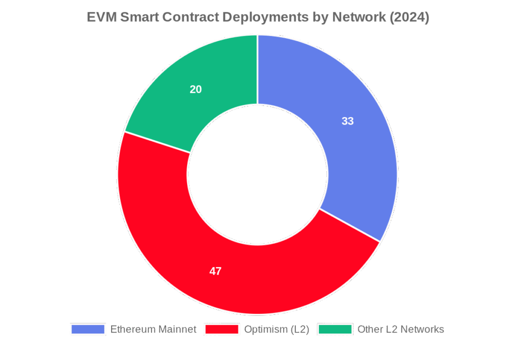 That’s part of why Layer-2 networks (Optimism, Arbitrum, Base) exist. They run the same smart contract logic at a fraction of the cost by batching transactions off-chain and settling them on Ethereum’s mainnet. In 2024, L2s accounted for the majority of all EVM-compatible smart contract deployments worldwide.